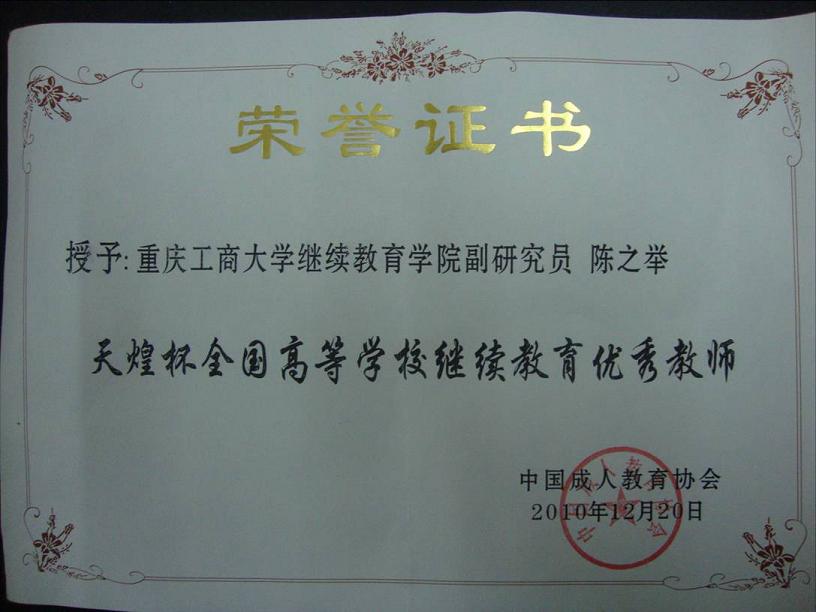 本次优秀教师评选采取限定100名并按省分配名额的办法,重庆市分配到两个名额。我市成人高等教育协会组织专家对各校推荐的数十名人选从从事成人教育工作年限、教学、科研情况等方面综合进行评选,我校2138cn太阳集团古天乐陈之举老师凭借十几年对成教事业的默默奉献、较强的科研能力和显著的工作业绩,荣获“全国成人高等教育继续教育优秀教师”荣誉称号,为我校争得了荣誉。