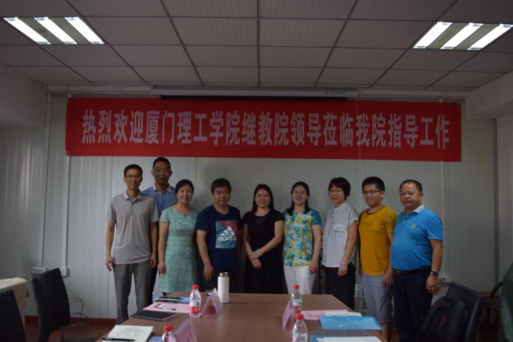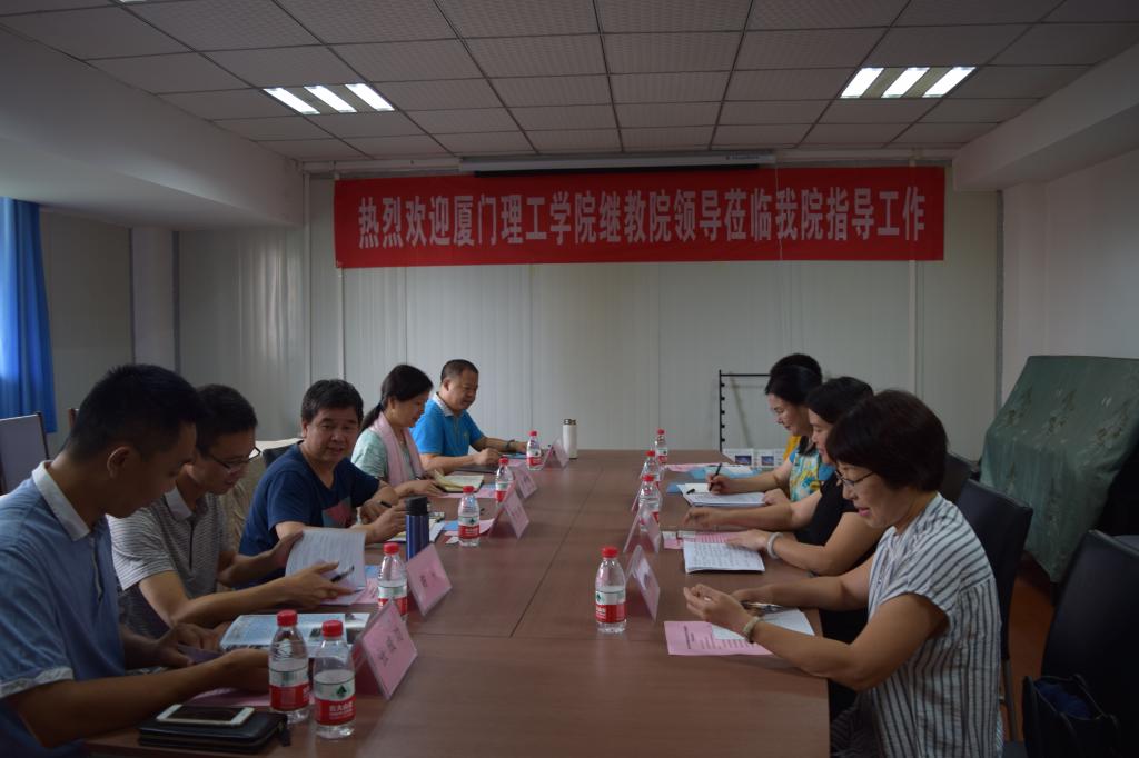 2017年9月1日,厦门理工学院2138cn太阳集团古天乐张晓娟副院长一行到我校交流工作。我校2138cn太阳集团古天乐胥江河院长、杜朝辉副院长、成教办谢华主任、培训班张成功主任、综合办主任陈之举参加了交流会。2138cn太阳集团古天乐杜朝辉副院长主持了本次交流会。胥江河院长和张晓娟副院长分别对双方学院基本情况做了介绍,随后,双方围绕继续教育招生情况、教学情况、规章制度等展开了热烈的讨论与交流。