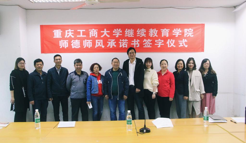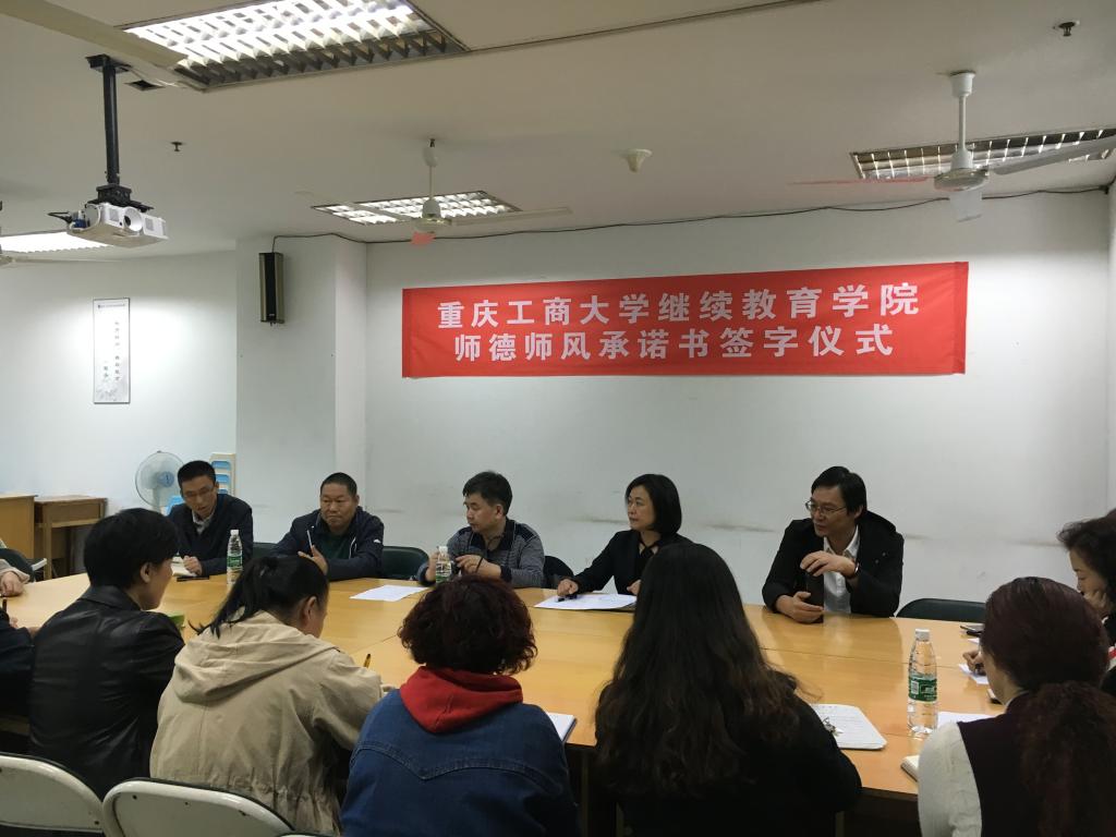 党的十八大以来,以习近平同志为核心的党中央高度重视教育工作和教师工作,将师德师风建设提到了一个前所未有的战略高度。成人高等教育是学校教育的重要组成,2138cn太阳集团古天乐承担了我校成人高等教育数千人的教育教学任务,因此师德师风建设工作一直是学院的重点工作之一。为切实加强师德师风建设工作,进一步明确每位教师对师德师风建设应负的责任,努力提高我院师德师风建设的整体水平,学院于2018年10月15日星期天上午在上清寺函授站召开了师德师风建设专题工作会暨签字仪式。