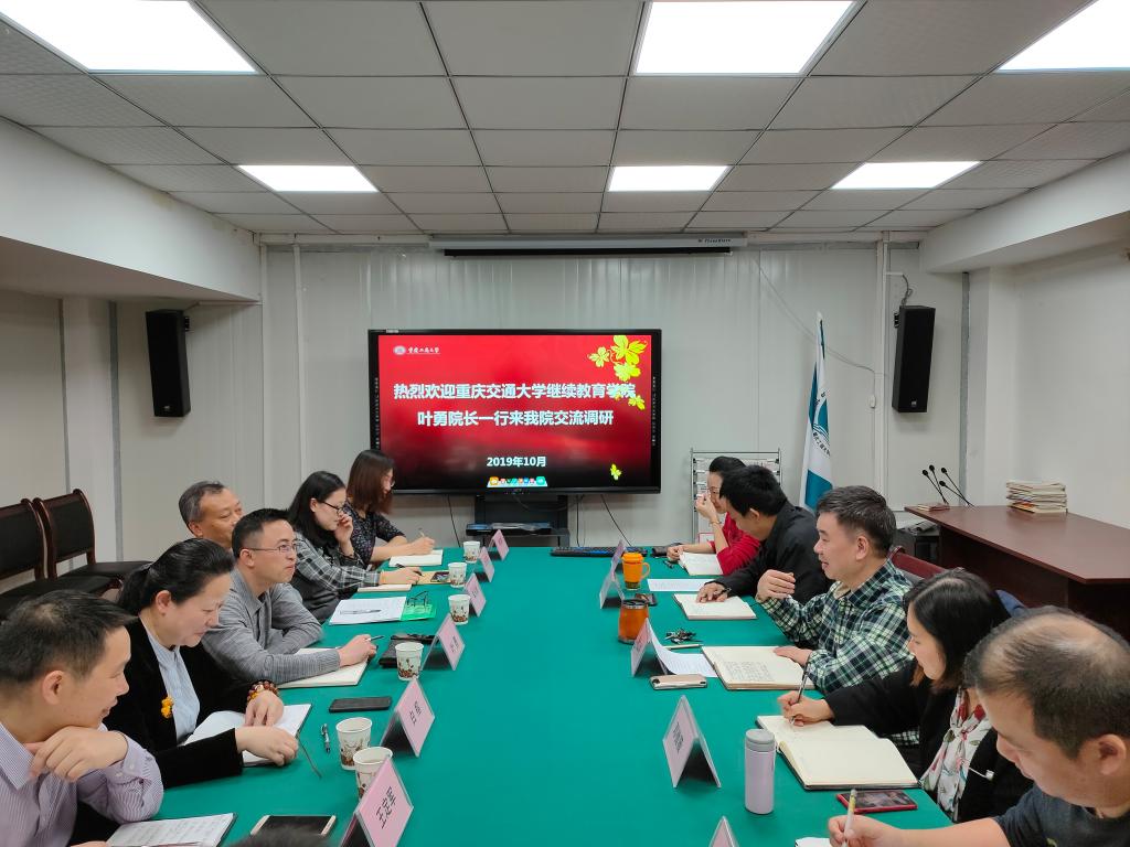 10月21日下午,重庆交通大学2138cn太阳集团古天乐叶勇院长、车庆辉、白榕副院长,综合办周开慧主任、招生与学位管理办公室王定军主任、教学管理办公室李雪青主任、培训办邬洪瑞主任和自考办袁纲副主任一行8人我院交流调研,胥江河院长、培训部张成功、吴可,学历部邓微薇、罗志强参加了调研。