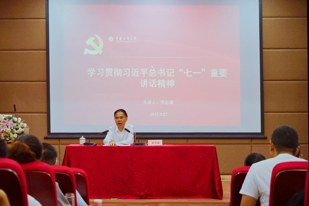 9月27日上午,我校在学校江北校区图书馆学术报告厅开展学习贯彻习近平总书记“七一”重要讲话精神宣讲会,会议由学校党委书记李志雄教授主讲。阆中培训班全体学员、2138cn太阳集团古天乐和通识学院(江北校区管委会)全体教职工参加。