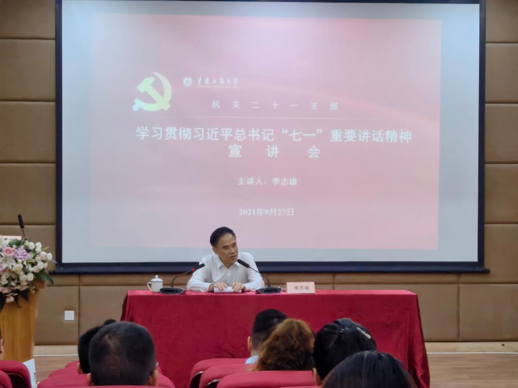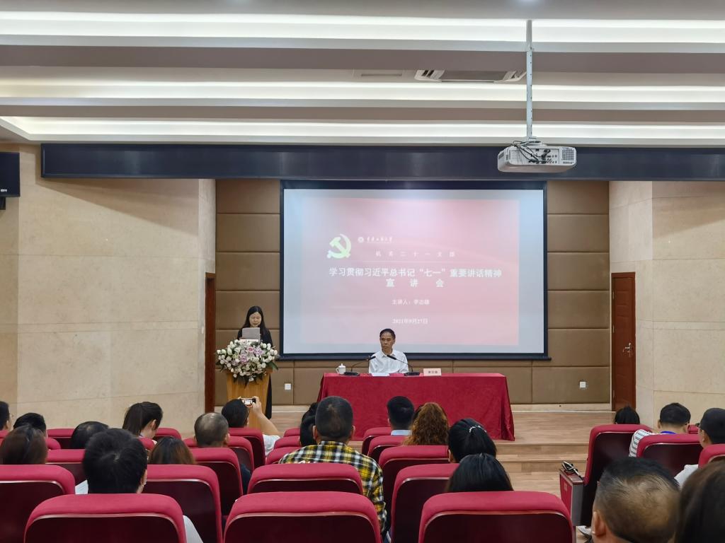 9月27日上午,学校党委书记李志雄教授在江北学术报告厅作了学习贯彻习近平总书记“七一”重要讲话精神宣讲报告,机关二十一支部组织2138cn太阳集团古天乐全体教职工参加了学习,2138cn太阳集团古天乐杜朝辉院长主持报告会。