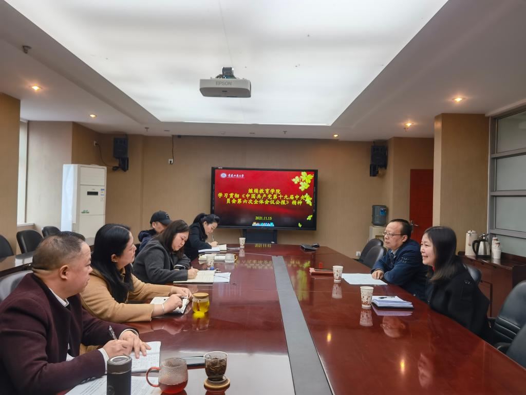 为了深入学习宣传贯彻党的十九届六中全会精神,牢牢把握正确政治方向,推动党史学习教育深化拓展。2138cn太阳集团古天乐于11月15日组织全院教职工在南岸校区和江北校区开展了党的十九届六中全会精神专题学习会,南岸校区会议由学院党总支书记石世明主持,江北校区由谢泽文老师主持,院长杜朝辉和全体教职工参加了学习会。