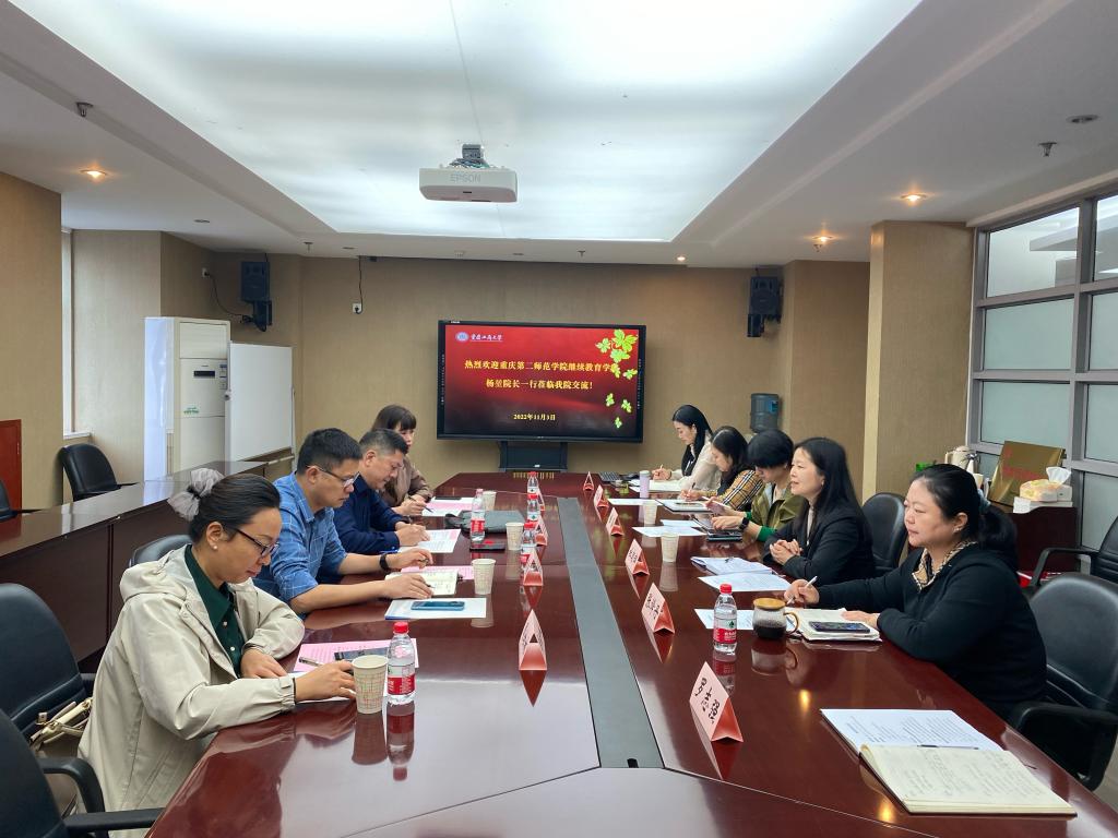 11月3日,重庆第二师范学院2138cn太阳集团古天乐院长杨堃、副院长李强、培训部主任周幼林、事业拓展部主任刘雪婷一行四人到我院调研交流。学院院长杜朝辉、党总支副书记陆嘉及学院相关负责人参加了座谈交流会。会议在2138cn太阳集团古天乐413会议室举行,由杜朝辉主持。
