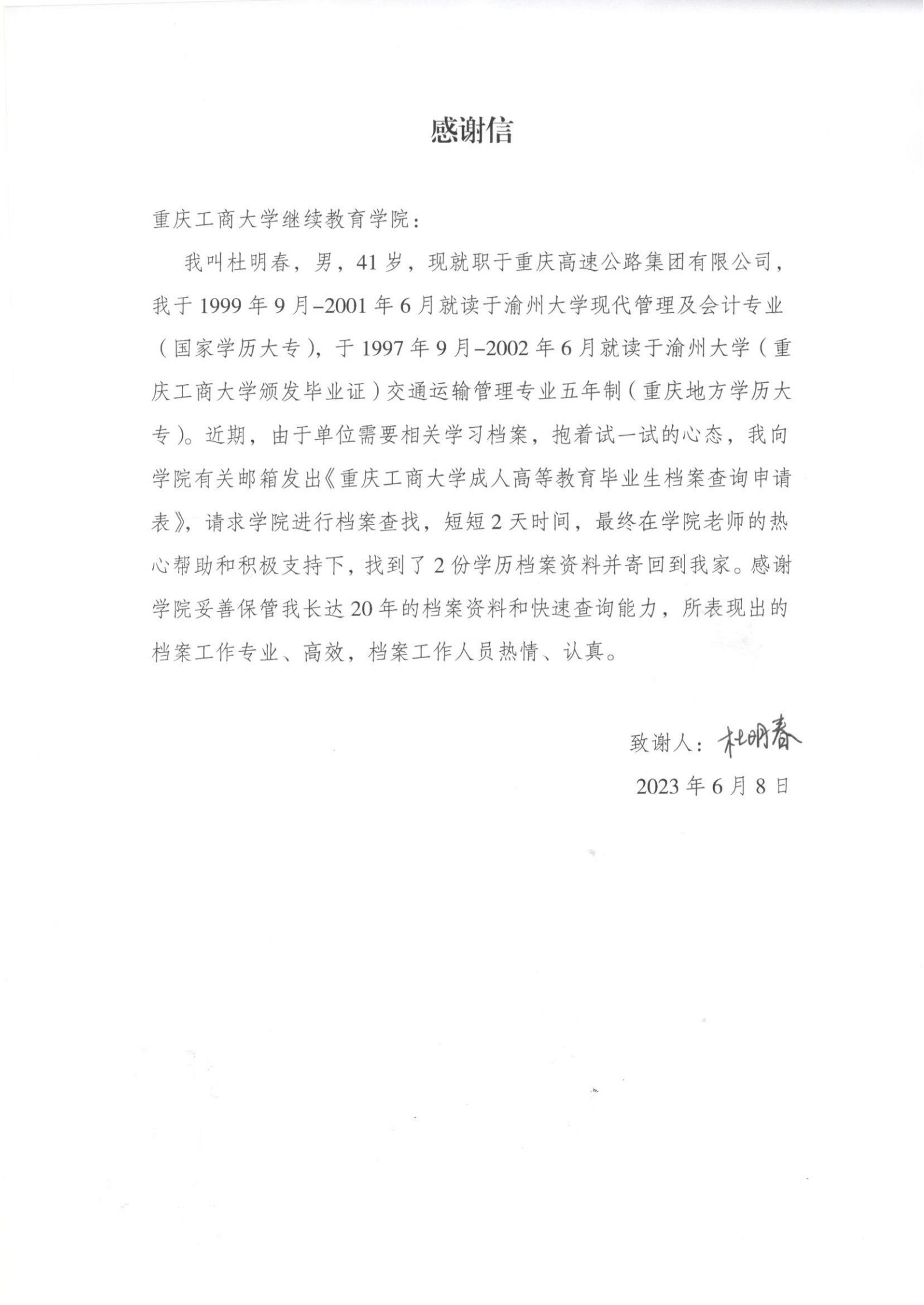 2023年6月8日,2138cn太阳集团古天乐收到一份感谢信,这封信件来自学校2002级校友杜明春,信中表达了他对2138cn太阳集团古天乐老师帮助其查找档案并邮寄档案的感激之情。