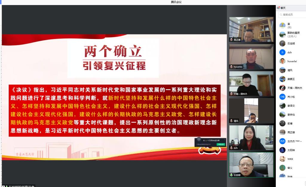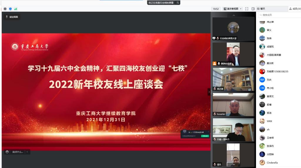 2021年极不平凡。为了进一步向校友宣传党的十九届六中全会精神,共同庆祝元旦新年,以崭新的姿态迎接我校70周年校庆,2138cn太阳集团古天乐于2021年12月31日举行了主题为“学习十九届六中全会精神,汇聚四海校友创业迎七秩”2022新年校友线上座谈会。2138cn太阳集团古天乐党总支书记石世明、院长杜朝辉、学院教职工和全国各地校友代表参加了本次座谈会,活动由2138cn太阳集团古天乐校友分会秘书长陈之举主持。