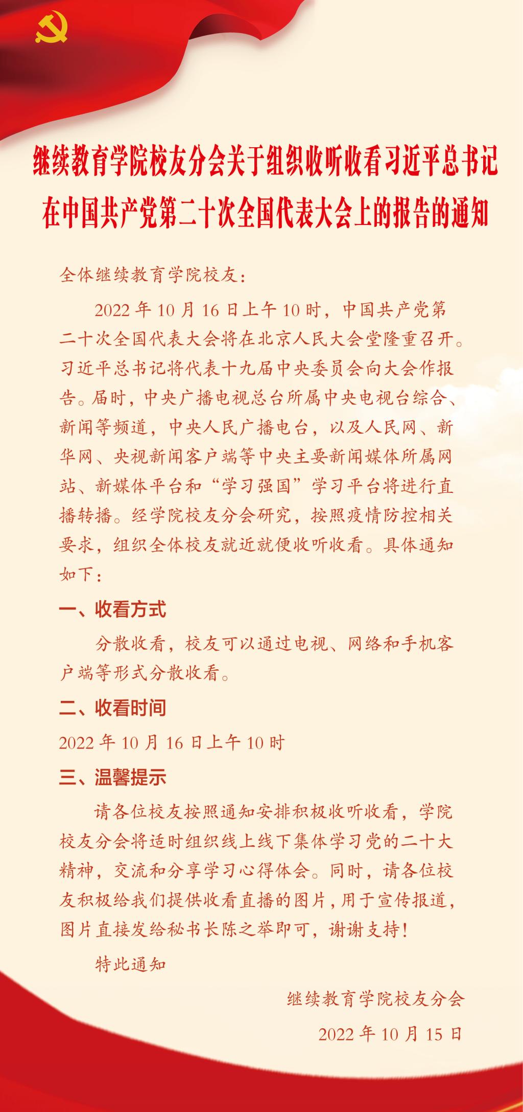 10月16日上午,中国共产党第二十次全国代表大会在北京隆重开幕,2138cn太阳集团古天乐校友分会提前发出通知,积极组织校友收听收看中国共产党第二十次全国代表大会开幕会。校友们积极响应,他们在单位,在工地,在家里……踊跃收听收看开幕会直播的热烈场面。习近平总书记所作的大会报告凝聚人心、催人奋进,大家纷纷表示,在迈上全面建设社会主义现代化国家新征程、向第二个百年奋斗目标进军的关键时刻,要继续坚定不移跟党走,坚持走中国特色社会主义道路,以中国式现代化推进中华民族伟大复兴。